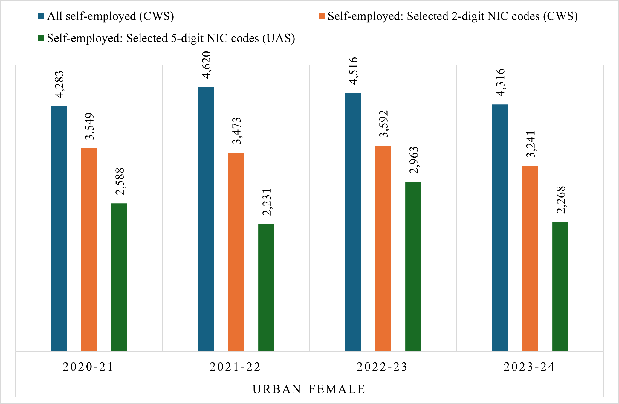 It is important to note that in the post-Covid-19 period (2021-22 to 2022-23), the absolute number of self-employed women working in selected 5-digit NIC codes has increased in both rural and urban areas, along with a rise in their average earnings as per UAS. This indicates that these activities provided some help in coping with Covid-19-led distress on the employment front.