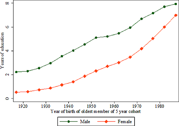 Notes: Figure 1 shows the average educational attainment of the group (cohort) of men and women born in a particular year (depicted on the horizontal axis). Groups are averaged over five years to always include a year ending in zero or five since many Indians (particularly those with little education) cannot accurately report their year of birth Groups born after 1987 may not have fully finished their education and so are not included. Source: National Sample Surveys (NSS) and Fulford (2014).