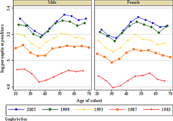Comparing the household consumption per person of age groups across states and over time, I find that an extra year of education for men means they live in households with 3% higher consumption per person. But better-educated women do not live in households that spend more on average3. It seems that we can explain very little of the variation in consumption across age groups and states with education.