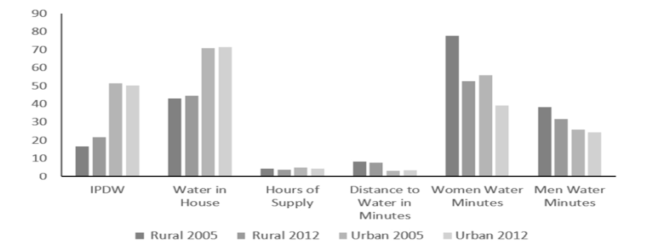 टिप्पणियाँ: (i) आईपीडीडब्ल्यू और 'घर में पानी' को प्रतिशत में दर्शाया है। (ii) पानी की आपूर्ति के घंटे, और जल संग्रह के मिनट का दैनिक औसत, पानी लाने के लिए कम से कम कुछ समय व्यतीत किया है तो दर्शाया है।