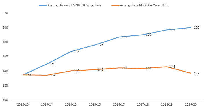 Note: The average nominal MNREGA wage rate is calculated as a weighted average of state-specific MNREGA wage rates, using person-days of MNREGA employment as weights. The average real MNREGA wage rate is calculated by deflating the average nominal MNREGA wage rate using Consumer Price Index of Agricultural Labour (CPIAL).
