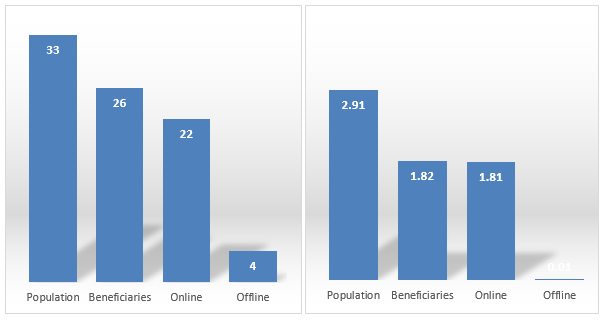 The importance of the PDS for Jharkhand can hardly be overstated. More than three-quarters of the state’s residents are eligible for PDS rations. Figure 1 shows the beneficiary coverage and its distribution between online and offline systems for Ranchi district and Jharkhand as a whole. As can be seen, the proportion of beneficiaries covered by the online system is around 84% in Jharkhand as a whole, and close to 100% in Ranchi district.