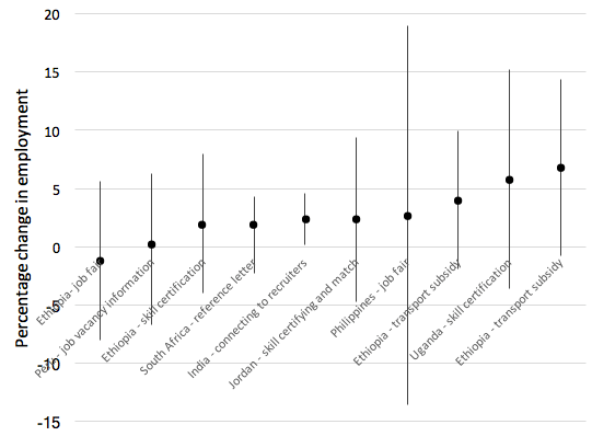 A final class of studies considers programmes designed to reduce information and search frictions, and to better match workers and firms together. These include public information services, job fairs, certification of hard and soft skills, and transport subsidies. These services tend to be much cheaper than training or wage subsidies, costing US$25 or less per person assisted.
