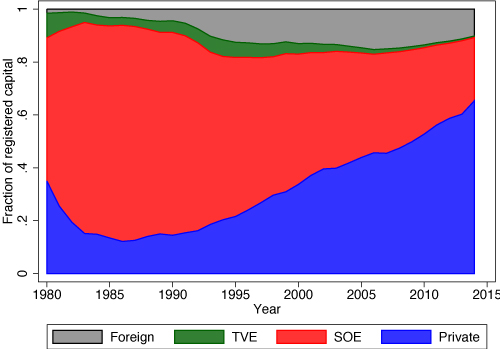 China has witnessed the same degree of industrialisation in three decades as Europe did in two centuries (Summers 2007). This economic transformation began in the early 1980s with the establishment of township-village enterprises (TVEs) and accelerated with the entry of private firms in the 1990s. Starting with almost no private firms in 1990, there were 15 million registered private firms in 2014, accounting for over 90% of all registered firms and 60% of aggregate industrial production.
