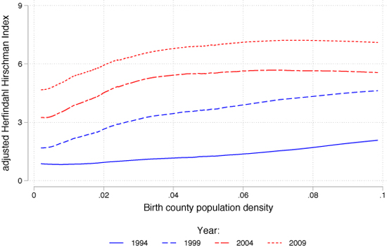 While population density may be positively associated with social connectedness in a county, it could also be correlated with other characteristics that independently determine entry, concentration, or firm size. For example, population density is associated with education and the traditional occupational structure in a county, both of which could generate greater entry without requiring a role for networks. The empirical analysis addresses this concern by showing that the main predictions hold even after controlling for these variables. Moreover, these alternative factors would not explain the model’s predictions for concentration or firm size. Another possible concern is that higher population density origins could have better access to favourable destinations, with superior government infrastructure, or larger clusters of firms from whom new entrants could benefit. This hypothesis could account for many features of our model, but it would not explain why we observe greater entry, smaller initial firm size, and higher subsequent growth by firms from more socially connected origins within the same destination. In general, alternative explanations are consistent with some of our model’s predictions, but not all of them simultaneously.
