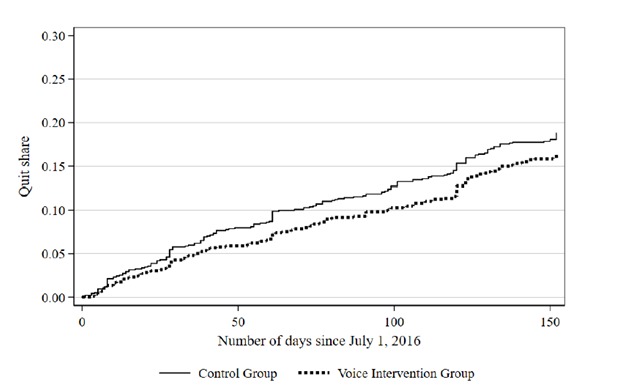 Results also show that the intervention reduced quit rates. Specifically, we found that those who were subjected to the intervention were, on average, 20% less likely to quit than the others in the period from July to November 2016. Figure 1 shows the cumulative share of the sample that left the firm, starting in July 2016 (the first month after the voice intervention) until the end of November 2016. By the end of November, quit shares were approximately 2 percentage points lower in the intervention group than in the group that did not receive the intervention.