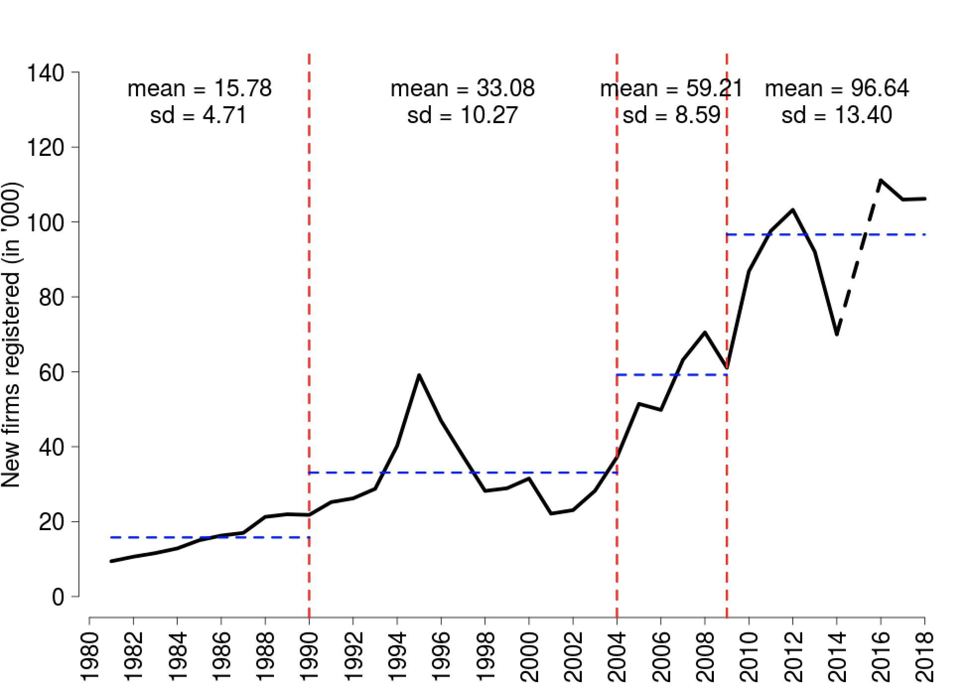 We find that on an average, 45,600 new firms got registered every year in India during the four decades for which we have data. The average annual growth rate of firm formation in the formal sector is 7.5% for the entire period. For the first 15 years in the run up to the liberalisation reforms of the early 1990s, there was a steady growth in firm formation in a low volatility environment.