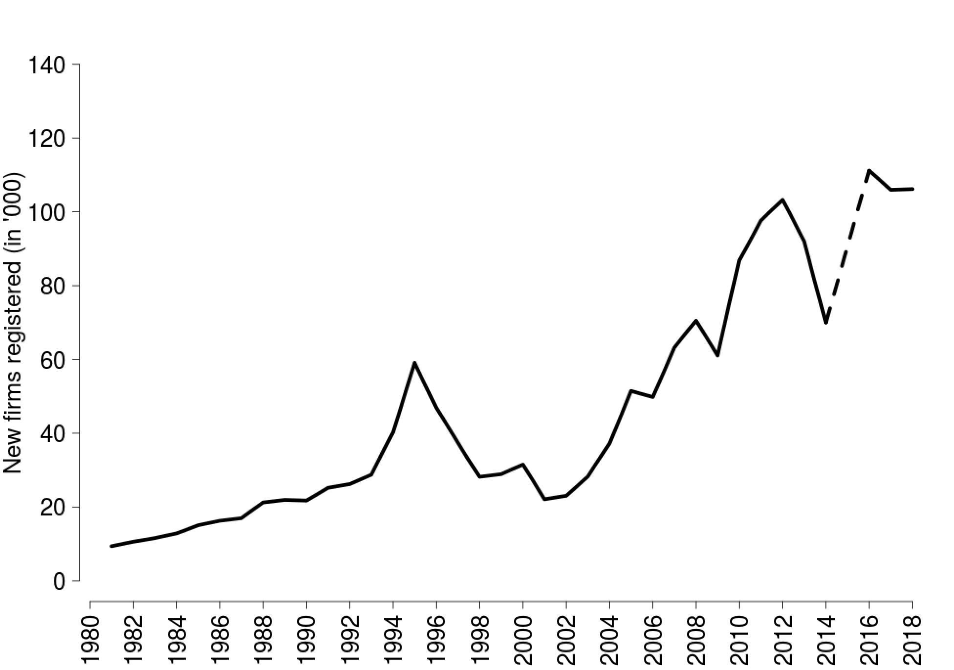 In absence of any universally accepted definition of entrepreneurship, following some of the studies in the literature we define firm formation as the setting up by an individual or a group of a unit in the formal sector that is aimed at undertaking economic activities and is incorporated as a legal entity. Specifically, we look at the number of new firms registered every year under: (a) the Companies Act, 2013 or Companies Act, 1956; and (b) the Limited Liability Partnership (LLP) Act, 2008 over the last four decades. We also include foreign companies and LLPs, where the established place of business is India. We include newly registered firms in our sample irrespective of the current status of the entities (that is, active, inactive, struck-off, etc.). The objective is to document the total number of new firms formed every year.