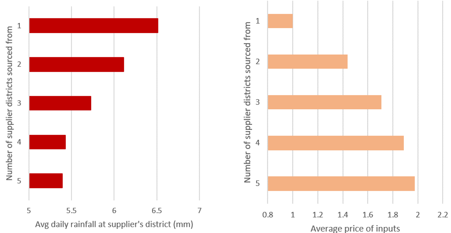 Our analysis reveals clear patterns in how firms respond to climate risks. First, we argue that there is supply chain diversification – 96.5% of total purchases come from firms with more than one supplier-district. Firms in regions exposed to high climate risk are more likely to diversify their supply chains, sourcing identical inputs from multiple suppliers spread across different areas. Firms that source from five different districts have 17% higher rainfall than firms that source from just one district (Figure 1, left panel). This strategy of supplier diversification ensures that a disruption in one region does not halt production entirely.