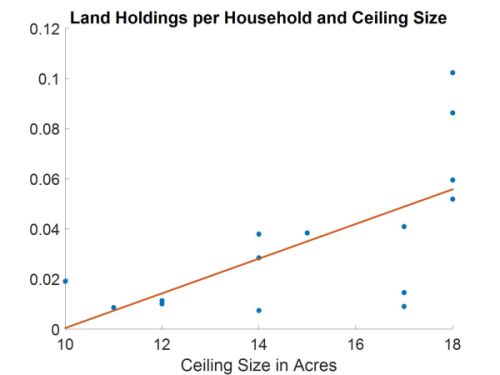 We also find direct evidence supporting the mechanism behind our conjecture. Specifically, we find that the size of household land holdings is smaller in states with more restrictive ceilings. Figure 1 illustrates this point. Smaller land plots suggest more land fragmentation, that is, a larger number of owners per unit of land, and thus higher transaction costs for acquiring a given acreage of land.