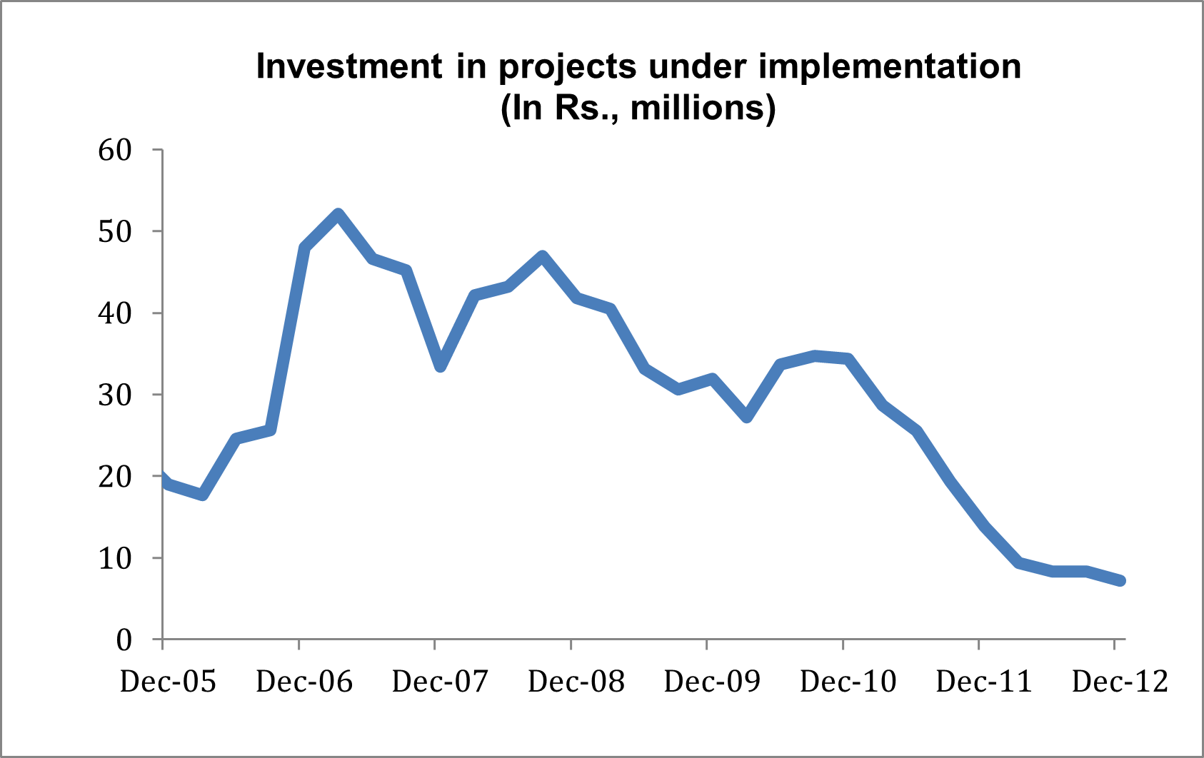 India’s economy faced a challenging 2012. This is reflected by the continued slowing down of GDP growth (Figure 1), inflationary pressures, and persistently high fiscal and current account deficits. The situation is further worsened by the sharp fall in the value of the rupee against the US dollar (25% decline since mid-2011). Besides, there is little sign of improvement in investment. Despite the government embarking on a reform programme in September last year, which included a long-awaited opening up to foreign direct investment (FDI), overall investment activity has remained subdued. Figure 2 shows a sustained slide in investment projects under implementation.