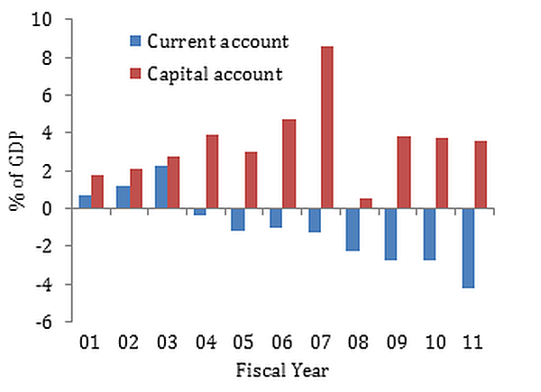 The widening current account deficit (CAD) also remains a major source of concern. While the approach of stimulating domestic demand via fiscal expansion in 2008 put India’s economy back on track after the global financial crisis, the inertia in withdrawing stimulus had subsequently led to a spike in inflation that prompted monetary policy tightening10, and dampened aggregate demand. Gross investment (especially private) and savings slowed as a result. Total savings declined from the peak of 36.8% in FY2007-2008 to 32.3% in FY2010-2011. This decline of 4.5% of GDP exceeded the fall in gross investment of 3% of GDP during the same period. Reflecting the widening gap between savings and investment, India’s CAD increased in the post-credit crisis period (Figure 4). The decline in total savings, a large part of which stemmed mainly from the erosion in public savings due to falling government revenues, has pushed the CAD to the highest level since the 1991 balance of payments (BOP) crisis. During the 12 months ending March 2012, India had a CAD of $78.2 billion or 4.2% of GDP, which widened to 5.4% in the third quarter of 2012. This diverged from the -0.5 to -2% of GDP during 1990-2000, which policy makers have been conservatively maintaining since the 1991 BOP crisis. Historically, India has run a CAD primarily due to the policymakers pushing investments and growth higher than that supported by the domestic saving rate. After FY2008-2009, however, savings have been declining at a much faster rate than investment.