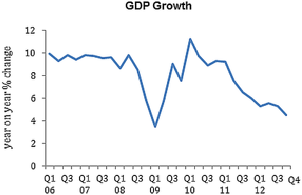 India faces a variety of short-term policy challenges, key among which is sluggish growth and high inflation. GDP growth slowed sharply to 4.5%2 in the last quarter of 2012, from 5.3% in Q3. Inflationary pressures remain persistent, despite headline inflation3 easing to 7.3% in the last quarter of 2012 from the highs of 9-10% over the last two years. The moderation was mainly on account of the recent cooling in (volatile) food and fuel prices. Inflation is still significantly above the Reserve Bank of India (RBI)’s comfort zone of 5-6% with underlying inflationary pressures being further supported by the pass-through effects of higher regulatory prices remaining incomplete4. Going forward, inflation expectations and core inflation5 are likely to remain elevated, limiting the scope for easing by the RBI to support GDP growth.