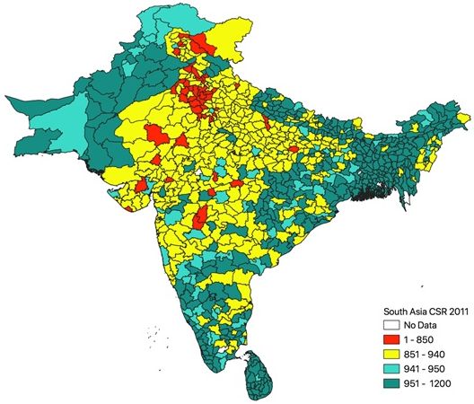 Figure 2. District-wise child sex ratios in selected South Asian countries, 2011
