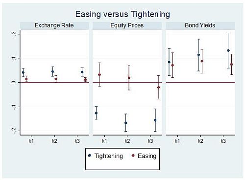 - We ask if the spillover is similar for an unanticipated tightening and an unanticipated easing of US policy. Results show that the spillover to exchange rates and equity prices is larger for a surprise tightening of US monetary policy than for an unanticipated easing. The spillover coefficient for exchange rates, for example, is twice as large for surprise tightening as for easing (see Figure 3).