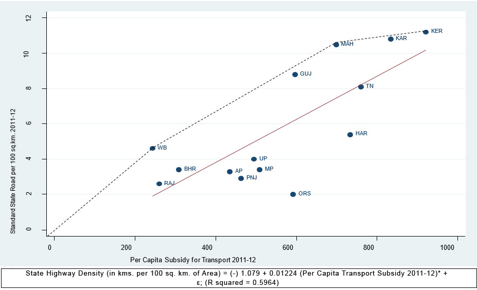 Among infrastructure services, there is a strong positive relationship between per-capita transport subsidy and state highway density (kms per 100 square km), which is statistically significant at 1% level (Figure 1). However, the relationship between power subsidy and per-capita consumption of electricity (kilowatt hour (kWh)) is not statistically significant.
