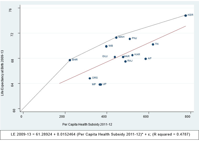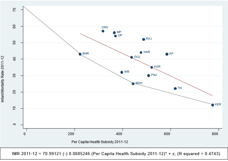 The relationships between per-capita subsidy for consumption of health services and health outcome indicators, namely, the Infant Mortality Rate (IMR) and life expectancy are presented in Figures 4a and 4b respectively. The two indicators have an inverse and a positive correlation with per capita healthcare subsidy, both again significant at 1% level.
