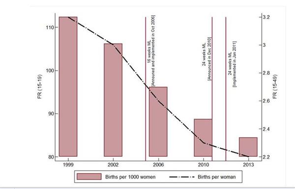 Bangladesh, like many other developing countries, is a high-fertility country. However, the country has seen a reduction in the average number of children per woman (total FR). This figure was around 3% from 1999 to 2006, and has since fallen consistently; reaching 2.2% in 2013, which is the lowest FR in South Asia (see Figure 2). Similarly, fertility of ages 15-19 fell considerably between 1999 and 2006 (from 112% to 96% per thousand women). This decrease was even more pronounced when paid ML was extended to eight weeks in 2010.