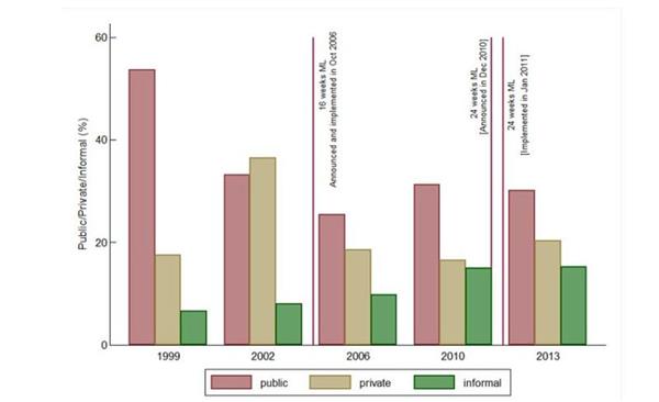 However, neither is apparent over the period of analysis (see Figure 3). There is little or no movement at all in public sector employment during the period when paid ML length was extended to 24 weeks (that is, between 2010 and 2013). A number of other significant changes have taken place over time: the percentage of women working in the private sector has risen by 4% while it has risen by only 1% in the informal sector. So, the female workers entering the labour force are more likely to participate in the private sector despite the shorter duration of paid ML. These findings may well be expected given a downward trend in fertility desires over time. This possibility clearly indicates the need for additional studies on the demographic effects of paid ML, especially in the public sector.