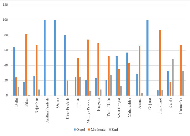 Next, we characterise the quality of the environment for deals in each state in terms of how quickly firms in that state can obtain an operating licence2. We define three kinds of deals – namely good, moderate, and bad deals – where a good deal is the case where firms get their operating licence within 15 days. Similarly, if firms get their licence between 15 and 45 days, we define it as a moderate deal. Finally, if it takes more than 45 days for firms to obtain the licence, we define it as a bad deal. As is clear from Figure 2, there is wide variation in deal-making across states in India. For example, a state like Uttar Pradesh has a high degree of good deals (100%) as compared to bad deals (0%), while a state like Kerala has a low degree of good deals (33%) as compared to bad deals (48%).