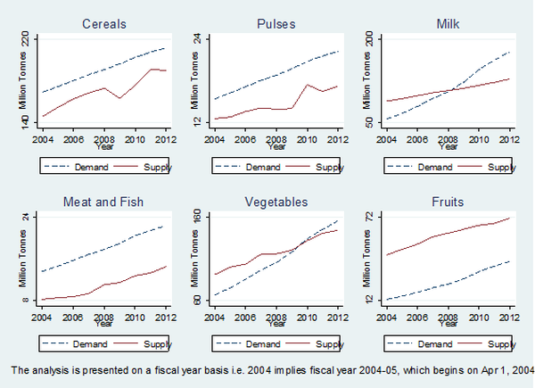 For cereals and pulses, during the period 2004-05 to 2012-13, supply has persistently lagged demand, with the gap widening in drought years (Figure 3). Similarly, in the case of meat and fish, supply has not kept pace with demand, and the gap has widened in recent years. High expenditure elasticity of demand for vegetables and milk has meant that the situation of excess supply that existed in the initial years transformed into a situation of excess demand in recent years. It is only in case of fruits that total supply is in excess of estimated demand. Thus, shift in demand towards high value food items in the face of rising household income partly explains the recent inflationary pressure on these commodities.