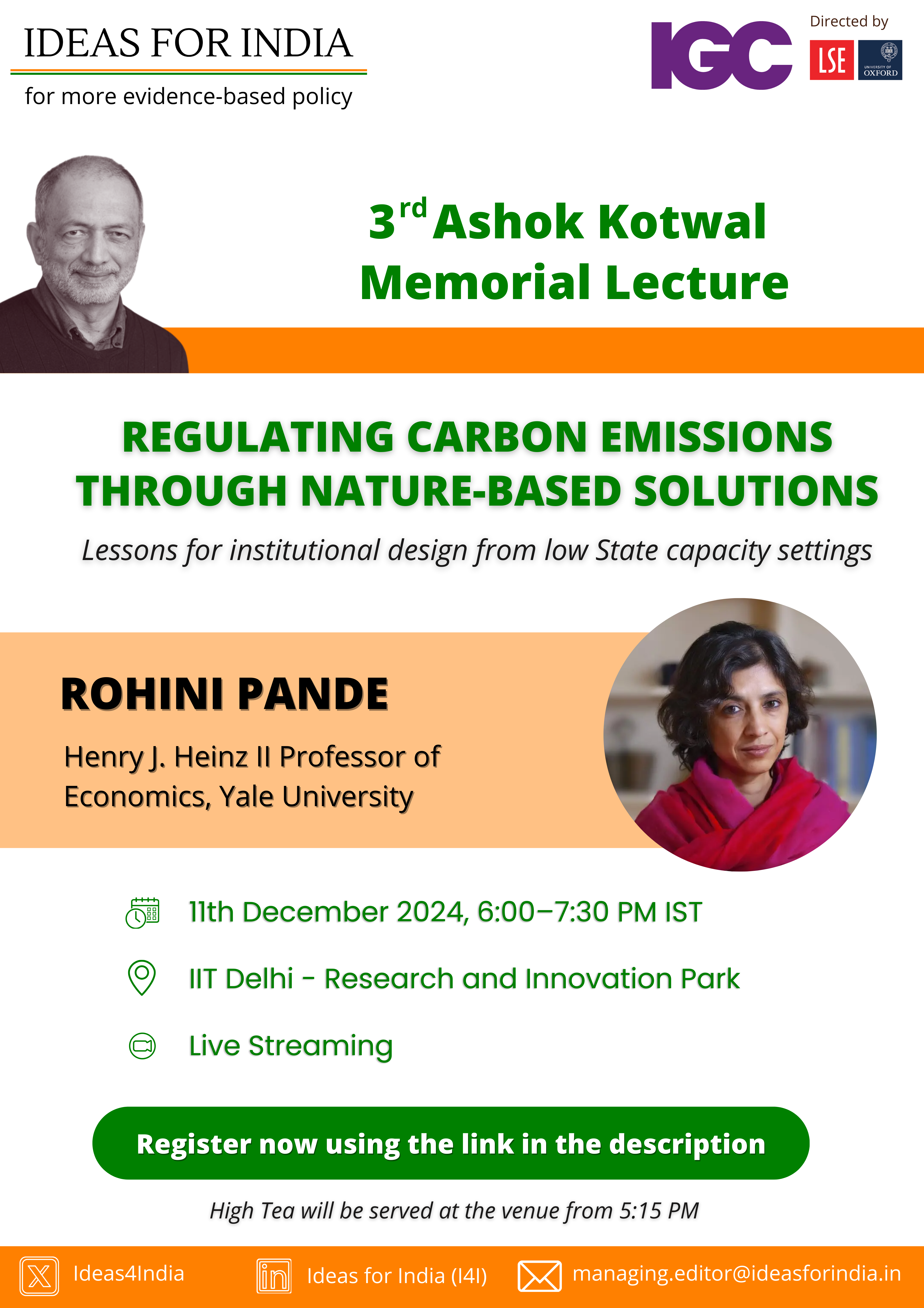 We invite you to join us on 11 December 2024, for the third annual Ashok Kotwal Memorial Lecture. This year, the lecture will be delivered by Professor Rohini Pande, who will draw on insights gained from the design of pollution compliance markets and environmental audits in India, to discuss how they can provide guidance on how to redesign the voluntary carbon market so that lower income countries can access international climate funds through nature-based activities.