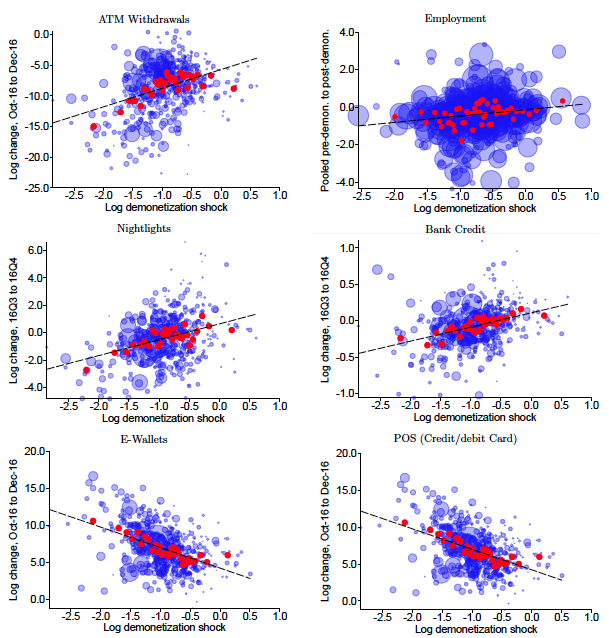 We study the consequences of demonetisation in the cross-section of Indian districts (roughly 600 districts partition the country). Using a comprehensive dataset from the RBI, we construct a local area demonetisation shock as the ratio of post-demonetisation to pre-demonetisation currency in each month. This approach recognises that, while extreme, at a national level the demonetisation episode constitutes only a single observation, and other economic shocks may have occurred during the period. On the other hand, it creates a challenge insofar as official, high-frequency measures of economic activity at the district level do not exist. We combine data from several sources, including (i) ATM withdrawals; (ii) satellite data on human generated nightlight activity, a proxy for economic output used in many circumstances where official data do not exist (Henderson et al. 2012); (iii) a new survey-based measure of employment; (iv) e-wallet and debit card transactions; and (iii) deposit and credit growth.