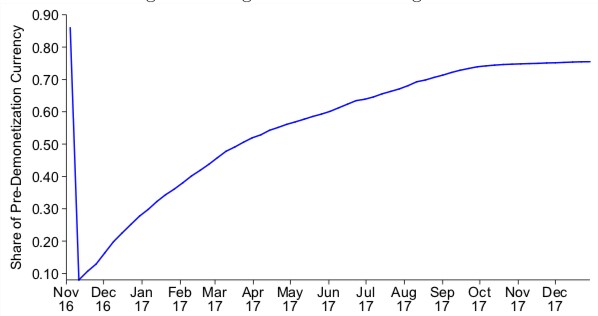 In a recent paper, my co-authors Gita Gopinath, Prachi Mishra, and Abhinav Naryanan, and I analyse this episode (Chodorow-Reich et al. 2019). Figure 1 shows the path of large legal tender notes as a share of total pre-demonetisation currency outstanding. Together, these notes accounted for about 86% of currency outstanding. At the time of the announcement, the government had printed new notes equal to about 10% of the pre-demonetisation stock of currency, so that total currency usable as legal tender declined by 75% overnight.