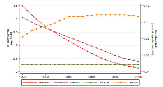 This study is based on the DHS datasets for both countries (known as NFHS (National Family Health Survey) for India). Those for Bangladesh relate to 1993-94, 1999-2000, 2004, and 2014, and the NFHS are for the years, 1991-92, 1989-99, 2005, and 2015. In addition, we used TFR for woman aged 15-49 and SR at birth based on information provided in the World Development Indicators (WDI) available from the World Bank. A comparison between the fertility rates calculated from the surveys with that from the WDI confirms robustness of these rates to datasets.