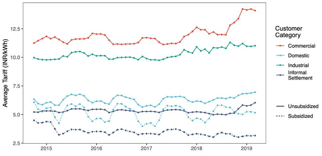 In order to evaluate these potential costs and benefits of retail electricity pricing reform, we provide empirical evidence on the consumption and non-payment responses of electricity customers, to retail prices in Delhi. Beginning in the late 1990s, Delhi pursued an ambitious set of reforms to its electricity sector that included partially privatising its distribution segment, formalising the connections of thousands of informal settlement customers, and incentivising investments in improved reliability and service quality. These reforms and investments in service quality were financed largely by approximately tripling average retail electricity prices over the course of a decade. Local elections in 2015 brought a populist government – led by the Aam Aadmi Party (AAP) – into power in part on promises of reversing these price increases. During the period we study, 2015 to 2019, the government reduced average prices for residential customers by 10%-18%, with small residential customers receiving the largest reductions.