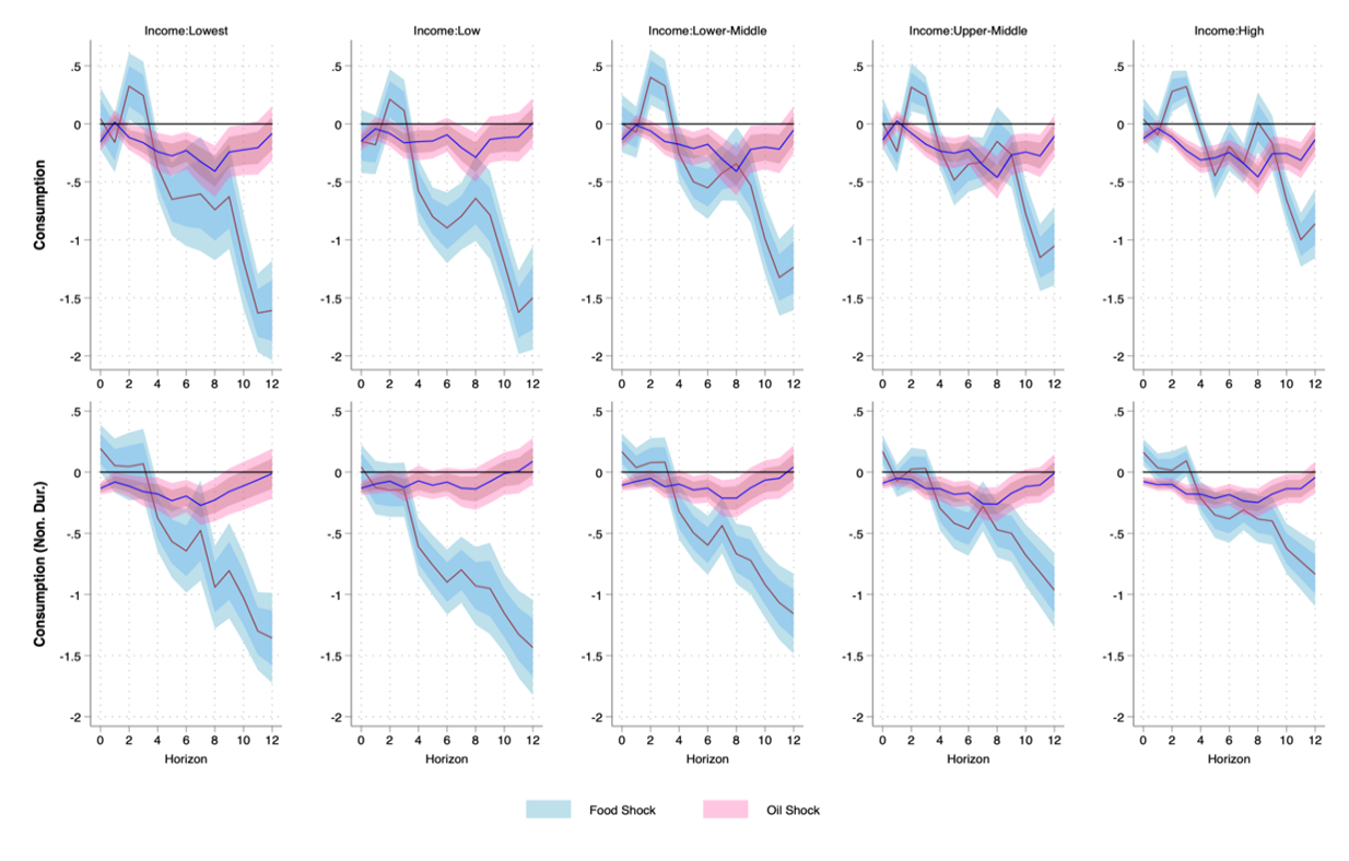 As illustrated in Figure 1 below, there is a clear decline in household real consumption in response to increased food prices. Importantly, the effects are monotonically larger on poorer households, implying an increase in consumption inequality with an increase in global food prices. These effects are also economically meaningful: an average food price increase of 3% results in over a 4% decline in real non-durable consumption for the poorest households, a 3% decline for middle-income groups, and a decline of more than 2.5% for wealthier households.