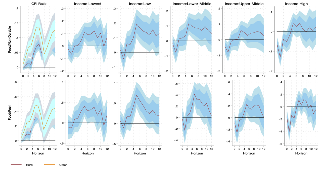 Notes: (i) Here we report cumulative IRFs where external shock is the log of changes in global oil and food price, which are instrumented by the corresponding supply shocks and the dependent (outcome) variable is the log of changes in household consumption. (ii) The light blue/pink region around the trend lines is the 90% confidence interval and the dark blue/pink region is the 68% confidence interval. A confidence interval is a way of expressing uncertainty about estimated effects – specifically, it means that if the study was repeated over and over with new samples, 90% and 68% of the time, respectively, the calculated confidence interval would contain the true effect.