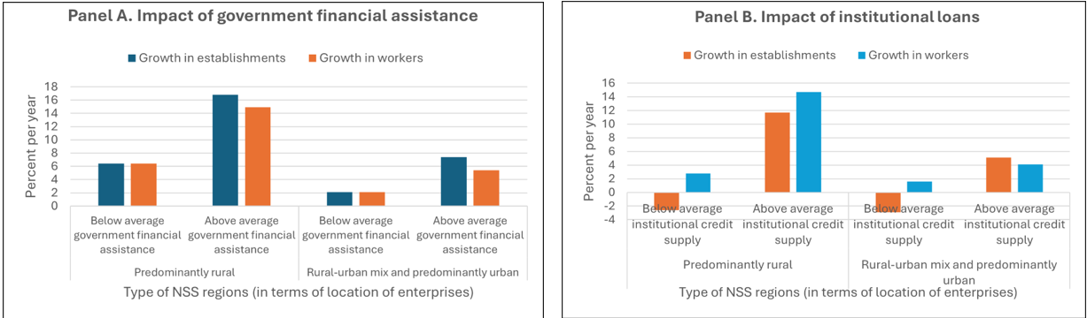 From a deeper analysis, we find that in NSS regions that are pre-dominantly rural (that is, more than 60% of the enterprises are in rural areas), institutional loans and government financial assistance made a big difference to the growth rate of establishments and employment. However, in NSS regions that are rural-urban mix or predominantly urban (about two-thirds of the NSS regions, as per the above criterion), the growth rates are low and institutional loans and government financial assistance yielded only a modest gain in growth performance (Figure 2).
