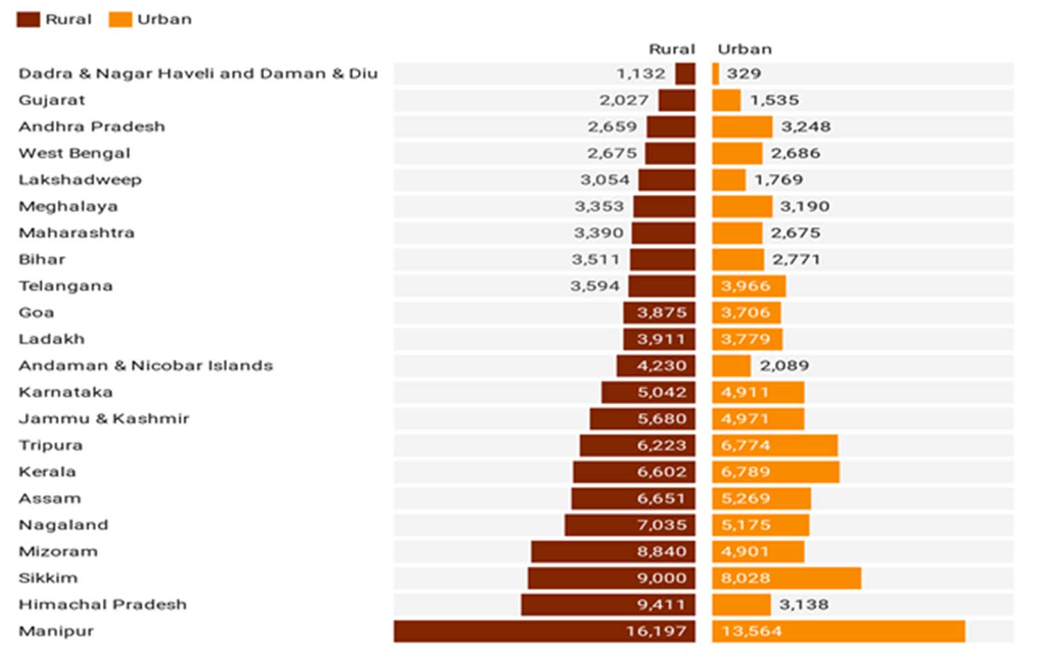 आकृति 3. सार्वजनिक स्वास्थ्य सुविधाओं में प्रसव पर ओओपी खर्च में ग्रामीण-शहरी अंतर, 2019-20