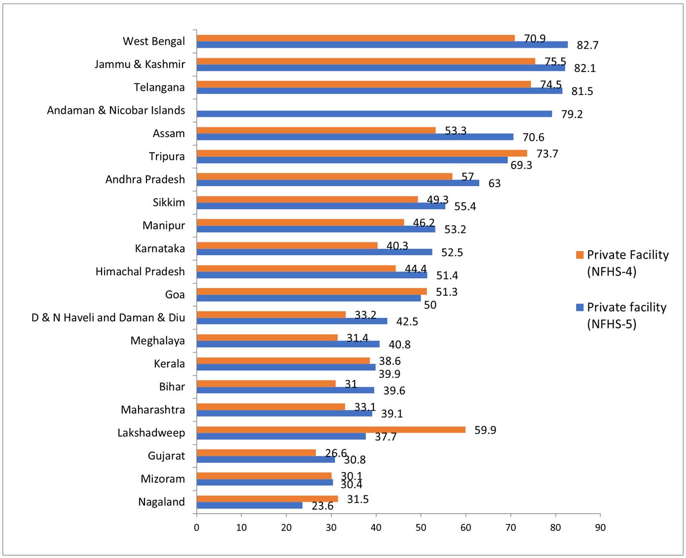 औसतन, देश भर में सी-सेक्शन प्रसव की दर 2015-16 में 17% थी, जो बढ़कर 2019-20 में 23.1% हो गई है, जिसमें तेलंगाना, आंध्र प्रदेश, जम्मू और कश्मीर, केरल तथा पश्चिम बंगाल चार्ट में सबसे ऊपर हैं। यह रुझान सार्वजनिक स्वास्थ्य के लिए चिंता का विषय है क्योंकि अंतरराष्ट्रीय स्वास्थ्य समुदाय द्वारा अनुशंसित दर 10-15% है (डब्ल्यूएचओ, 2015)। कुल मिलाकर, 2019-20 में 53.1% सी-सेक्शन प्रसव निजी सुविधाओं में हुए जो कि 2016 के 42% की तुलना में वृद्धि दिखाता है। सिक्किम, असम, कर्नाटक और त्रिपुरा में, 50% से अधिक सी-सेक्शन प्रसव निजी सुविधाओं में होते हैं। हालांकि, कुछ राज्यों में, सी-सेक्शन का प्रचलन अभी भी काफी कम है-उदाहरण के लिए, बिहार (3.6%), नागालैंड (8%), मेघालय (9.2%), मिजोरम (9.8%), और असम (15%) में, क्योंकि यहां इन प्रक्रियाओं को पूरा करने के लिए आवश्यक स्वास्थ्य बुनियादी ढांचा खराब है तथा मानव संसाधन की कमी है।