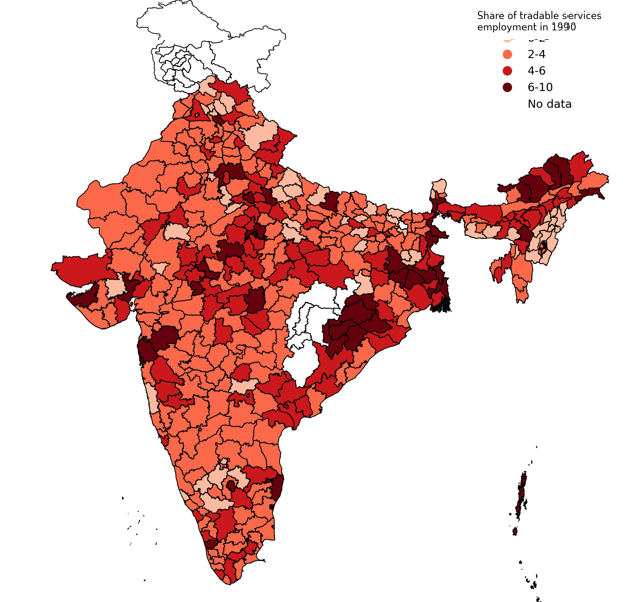 In a recent study (Avdiu et al. 2022), we study this question by assessing the effects of employment growth in tradable services on employment growth in non-tradable services, across Indian districts between 1990 and 2013.