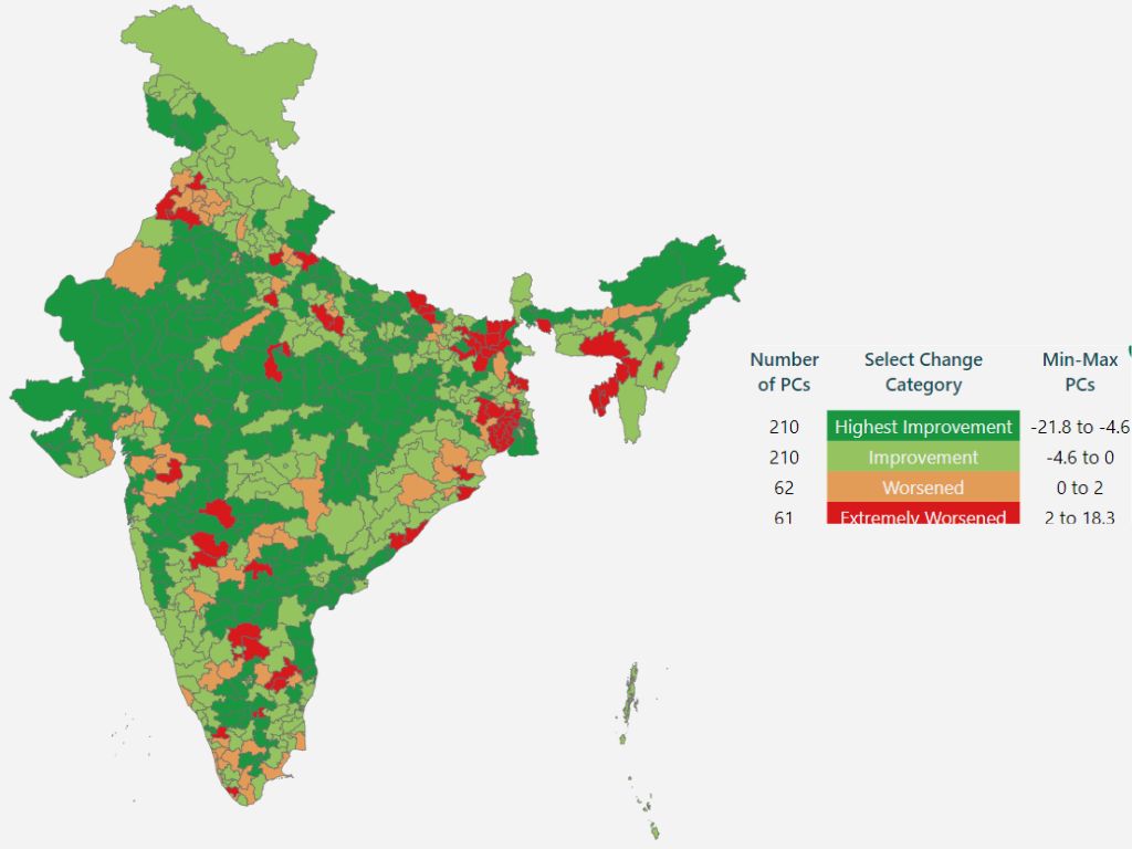 राष्ट्रीय महिला बाल विवाह दर एनएफएचएस-4 (2015-2016) में 26.8% थी, जो कम होकर एनएफएचएस-5 (2019-2021) में 23.3% हो गई है। इन पाँच वर्षों में हुई प्रगति उल्लेखनीय है, 77% संसदीय निर्वाचन क्षेत्रों में गिरावट दर्ज की गई है (आकृति-2 देखें)। हालाँकि शेष संसदीय निर्वाचन क्षेत्रों में बाल विवाह दर में औसतन 3.3 प्रतिशत अंकों की वृद्धि हुई है। कुछ पीसी में तो 10 प्रतिशत अंकों से भी अधिक की वृद्धि दर्ज की गई है।