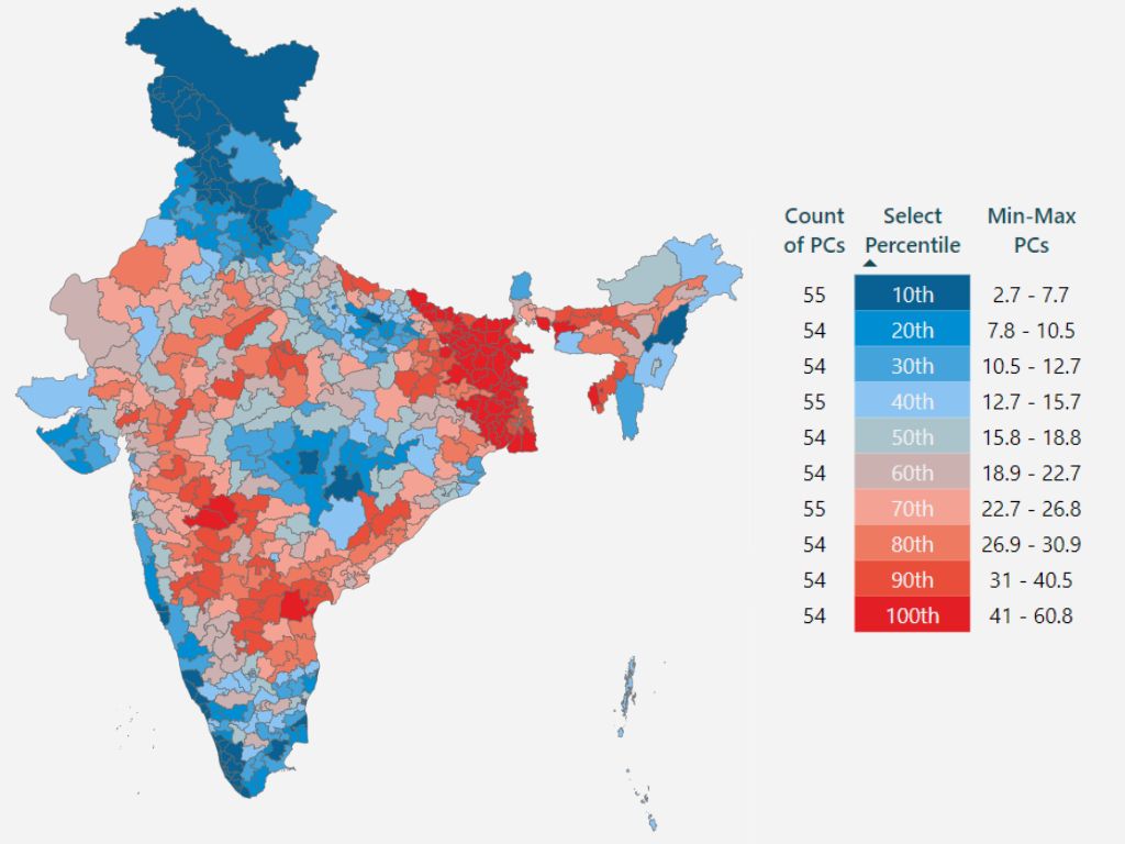 नोट : नीले से लाल रंग तक, महिलाओं के बाल विवाह के सबसे कम (और अधिकतम) प्रसार वाले संसदीय निर्वाचन क्षेत्रों के निचले (और सबसे ऊपर के) 10 प्रतिशतक को दर्शाया गया है।
