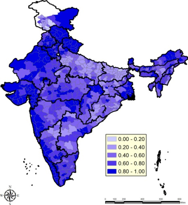 आकृति 1 जिला स्तर पर शौचालयों की उपलब्धता के साथ-साथ यह भी दर्शाता है कि हमारे अध्ययन के पहले और अंतिम वर्ष (2012-2016) के बीच इसमें किस प्रकार परिवर्तन आया है। यह स्पष्ट है कि शौचालयों की उपलब्धता में वृद्धि हुई है, लेकिन जिलों में इसकी वृद्धि दर भिन्न-भिन्न है। अभी तक इस कार्यक्रम का मूल्यांकन विभिन्न परिणामों पर इसके प्रभावों के संदर्भ में नहीं किया गया है। इस लेख में हमने अपने हालिया अध्ययन के निष्कर्षों को साझा किया है जो महिलाओं की सार्वजनिक सुरक्षा पर स्वच्छ भारत मिशन के प्रभाव का मूल्यांकन Sहै।2