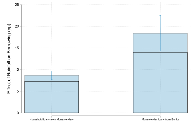 Note: (i) The vertical axis represents the incidence of borrowing, in percentage points. (ii) The first set of bars is households’ borrowing from moneylenders, while the second is moneylenders’ borrowing from banks. (iii) The black-outline bars represent borrowing in a year with average monsoon rainfall, while the blue solid bars represent the borrowing following a one-standard deviation increase in monsoon rainfall. (iv) The effect of the positive rainfall shock in percentage points is the difference between the blue bar and the black-outline bar. The blue error bars represent the 95% confidence interval. A 95% confidence interval is a way of expressing uncertainty about estimated effects. Specifically, it means that if you were to repeat the experiment over and over with new samples, 95% of the time the calculated confidence interval would contain the true effect. (v) The graph shows that 8.7% of households borrow following the positive rainfall shock, while 7.3% of households borrow on average. So, the 1.4 percentage point change in the graph is a (8.7 – 7.3)/7.3 = 19% change. For moneylenders, 18.4% of lenders borrow from banks following the positive rainfall shock, while 14% borrow on average. So, the 4.4 percentage point increase in the graph is a (18.4 – 14)/14 = 31% change.