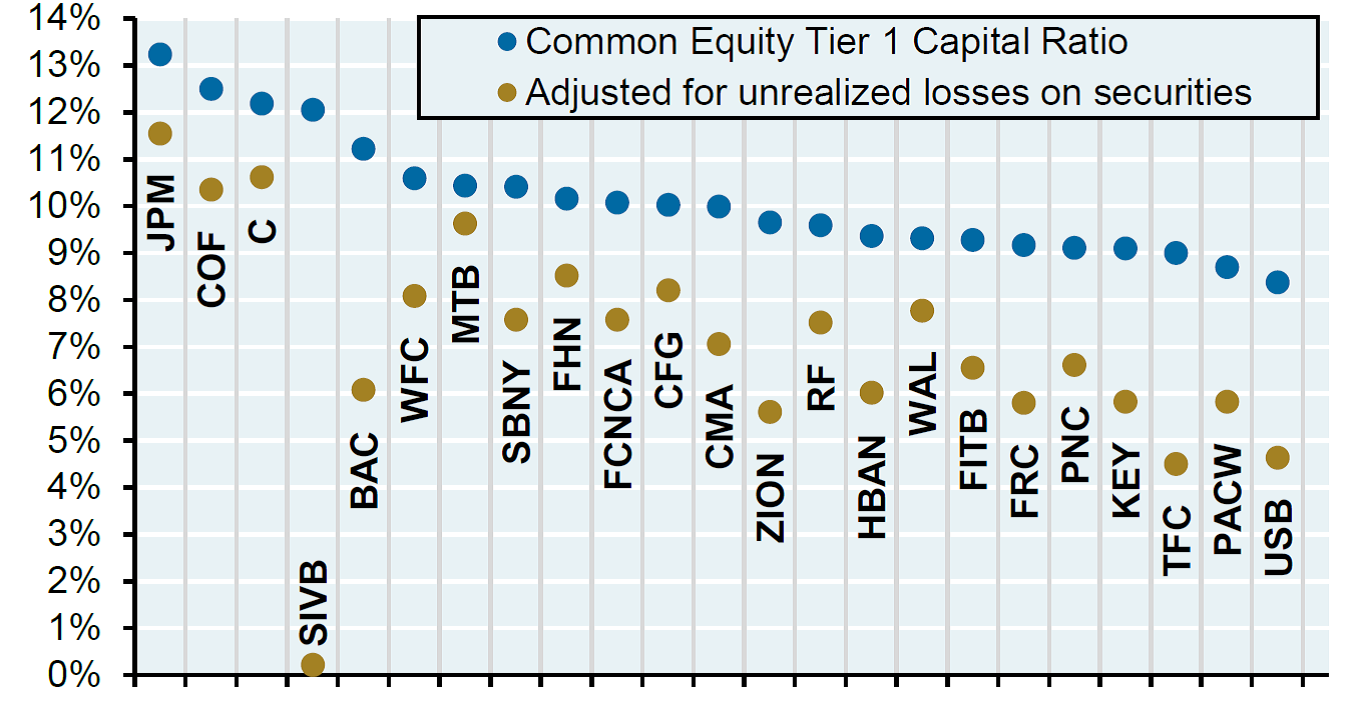 This time, both the quantum of rate rises, their rapidity, and bank holdings of interest-rate sensitive assets are all much larger, with the FDIC3 suggesting losses on available-for-sale (AFS) and held-to-maturity (HTM) bank securities holdings alone are over $600 billion (Figure 4). The capital for many large banks when properly marked (that is, reflecting a theoretical and immediate liquidation value of securities to the extent of each bank’s portion of runnable deposits) would likely be below the comfort zone of 8-10% Common Equity Tier 1 Capital Ratio4, as Figure 5 shows5.