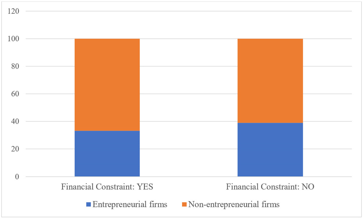 हम अपने डेटासेट में फर्मों के नमूने का उपयोग करते हुए, चित्र 1 और 2 में उद्यमिता की एक सरल और आकर्षक तस्वीर प्रस्तुत करते हैं। पुरुष-संचालित फर्मों की तुलना में महिला-संचालित फर्मों के उद्यमी होने की संभावना बहुत कम है (चित्र 1)- हमारी परिभाषा के अनुसार 41.9% पुरुष-संचालित फर्मों को उद्यमी फर्मों के रूप में वर्गीकृत किया गया है, जबकि महिला-संचालित फर्मों में उद्यमी फर्मों की हिस्सेदारी केवल 16.58% है। हम यह भी पाते हैं कि जिन फर्मों को वित्तीय बाधाओं का सामना नहीं करना पड़ रहा है,वे ऐसी बाधाओं वाली फर्मों की तुलना में उद्यमी होने की अधिक संभावना रखते हैं (चित्र 2)। यह वर्णनात्मक विश्लेषण शायद वित्त और उद्यमिता के बीच के संबंध पर कुछ प्रमाण उपलब्ध कराता है।