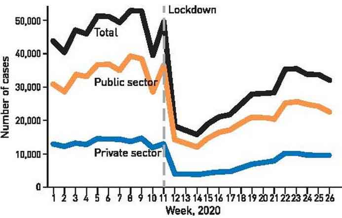 The Government of India requires that all cases of TB be notified, whether or not they are detected in a private or public health facility. Average notifications in the calendar year 2019 were slightly in excess of 200,000 cases a month: this trend continued into January and February of 2020 at exactly the same level – an average of 205,500. In March and April following the imposition of the national lockdown, the average fell to 125,500 a month, a drop of close to 40%. This is a huge fall in notifications, and it means that in just two months 150,000 cases of TB went ‘missing’. Figure 1 is reproduced from the 2020 Global Tuberculosis Report and shows how these notifications fell on a weekly basis in the period following the lockdown.
