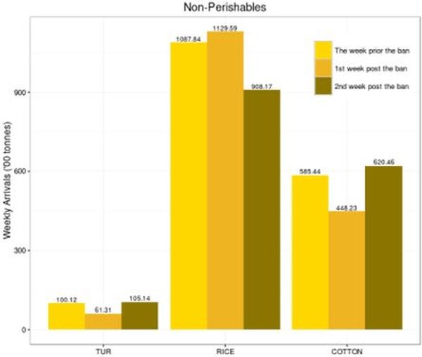 - These findings are a part of our ongoing work at the Indira Gandhi Institute of Development Research (IGIDR), analysing the impact of demonetisation on trade in perishables and non-perishable agricultural commodities. Data on daily mandi arrivals used in the analysis are obtained from www.agmarknet.nic.in. While as part of the project we are looking at all markets in India for 29 major commodities, here we report initial results for only a subset of these - only for major states including Karnataka, Gujarat, Haryana, Rajasthan, Uttar Pradesh, Maharashtra, and Andhra Pradesh.