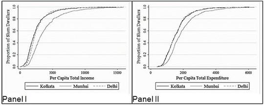 Figure 1 below presents the distributions of real per-capita incomes and real per-capita expenditures. Mumbai slum-dwellers appear to enjoy better monetary SoL, on average, than those in Kolkata and Delhi; the monetary SoL in Kolkata and Delhi slums are similar.
