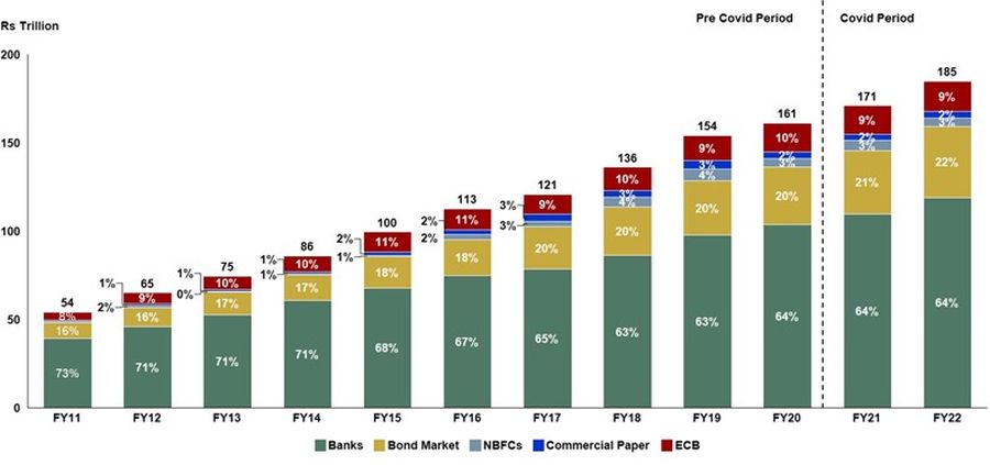 समकालीन भारतीय ऋण परिदृश्य में सबसे महत्वपूर्ण रुझानों में से एक, वाणिज्यिक (ग़ैर-सरकारी) ऋण की वृद्धि में गिरावट है। 2011-2015 में कुल वाणिज्यिक ऋण वृद्धि 16.4% थी, जो 2015-2020 में घटकर 10.1% हो गई। आकृति-1 में वर्ष 2011 से 2022 की अवधि में पारम्परिक ऋण स्रोतों के हिस्से के विकास को दर्शाया गया है। पारम्परिक रूप से, बैंक भारत में वाणिज्यिक ऋण के सबसे बड़े प्रदाता रहे हैं। पिछले दशक के दौरान कुल वाणिज्यिक ऋण में उनकी हिस्सेदारी, वर्ष 2011 में 73% के शिखर पर थी, जो गिरकर वर्ष 2022 में 64% हो गई। बैंक ऋण में आई इस कमी के अन्तर को कॉर्पोरेट बॉन्ड के जारीकरण और एनबीएफसी ने भर दिया।