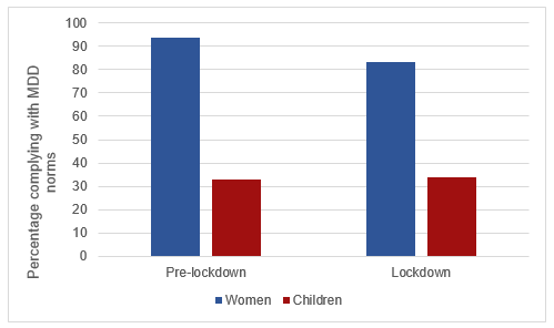 We show that the overall effect of the lockdown on dietary practices of women and children in rural Bihar, while serious, does not seem to be as disastrous as portrayed in other, earlier studies on the impact of Covid-19 (see Footnote 1). The percentage of women complying with MDD norms declined by 11 percentage points between the pre-lockdown period and during the lockdown (Figure 1). Among children aged 7-36 months, the proportion conforming to MDD norms remained the same, at around one-third. The average number of food groups consumed out of the eight food groups changed from 5.65 to 5.20 (for women) and from 2.89 to 3.15 (for children).