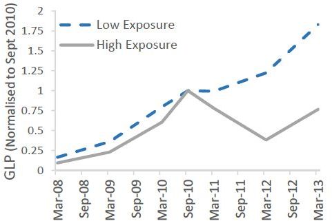 Figure 1 below shows how lending evolved over time. The dashed line shows lending by MFIs with low exposure to AP and the solid line shows lending by MFIs with high exposure to AP. Prior to October 2010, both groups of MFIs were experiencing similar rates of growth. After the ordinance was issued in October 2010, the lending patterns of the two groups diverged sharply. The low-exposure group continued to see growth in lending much as they did earlier, but the high-exposure group saw its lending fall sharply. This group of lenders did not begin to experience loan growth again until mid-2012. This is when the Reserve Bank of India assumed sole regulatory authority over the microcredit sector, resolving the risk of other states taking actions similar to that of AP.