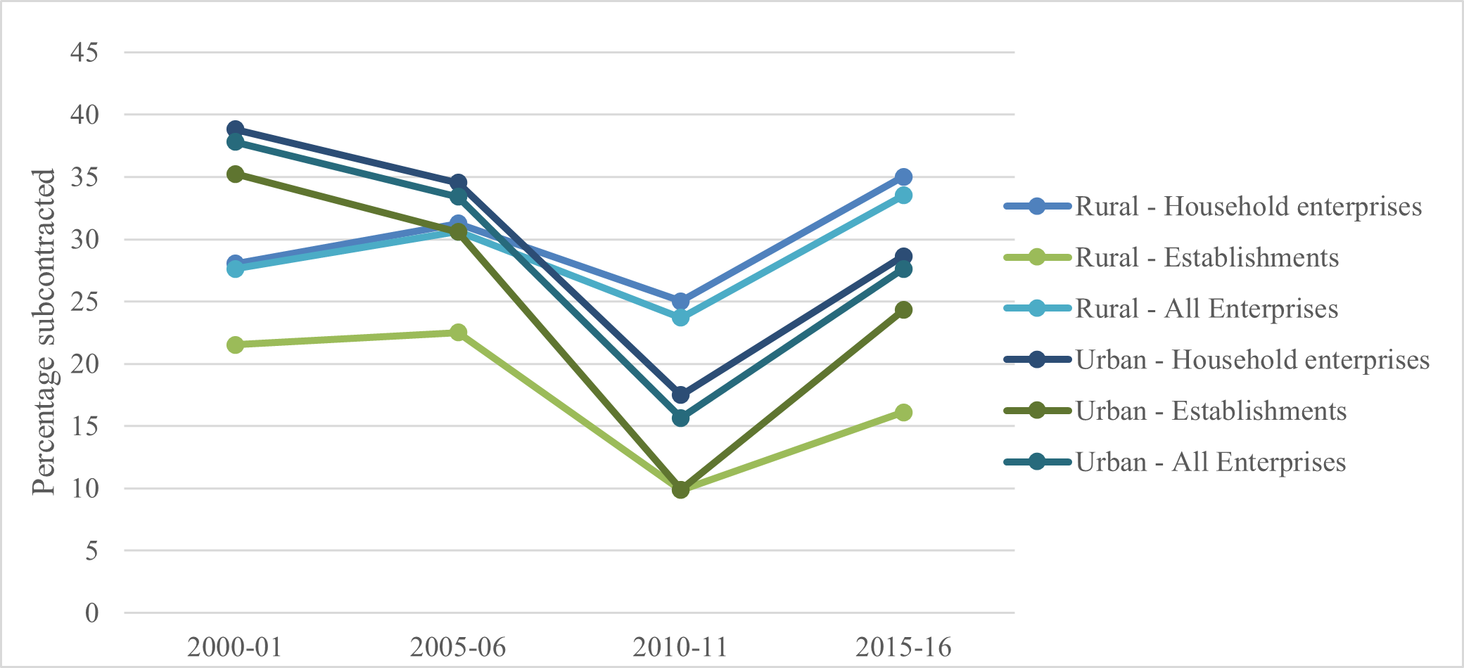 Less than 30% of informal enterprises have been in a subcontracting relationship at any point of time during 2001-2016. Overall, during this period, the incidence increased slightly in rural areas but fell by nearly 10 percentage points in urban areas (Figure 1).