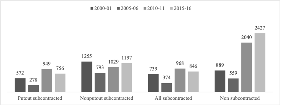 However, note that despite there being a striking gap between put-out and non-put-out subcontracted enterprises at the beginning of the period, the gap has somewhat narrowed over time due to a stagnancy in the net accumulation fund (NAF) of the latter. Therefore, being in a put-out relationship not only appears to be a dominant form of subcontracting in the informal sector, alternative, more autonomous subcontracting relationships also seem to have ceased to offer a significantly better alternative in terms of growth possibilities.